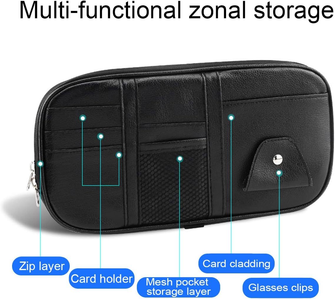 the sun visor organiser with sunglasses case, storage nets and zip storage pocket can store some small items such as torch, pens, pencils, small notepads, emergency rescue tools, maps, glasses, business card holder, etc., keeps your car clean and tidy.