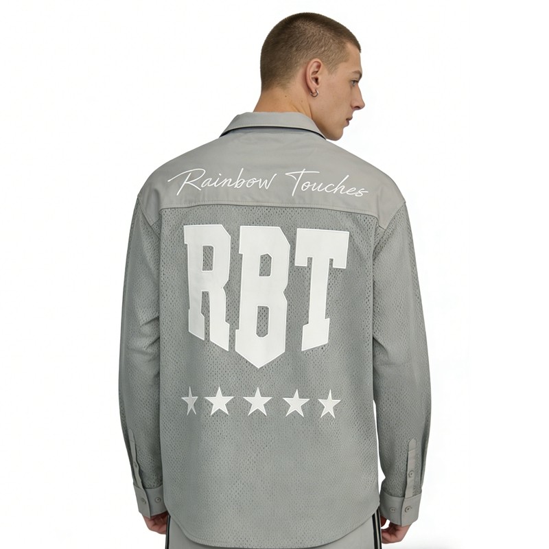 This streetwear mesh shirt features intricate patch embroidery of "RBT" and stars, plus script embroidery of "Rainbow Touches". Crafted from breathable mesh polyester with a relaxed fit, it’s perfect for urban street style, casual wear, and custom brand collections.