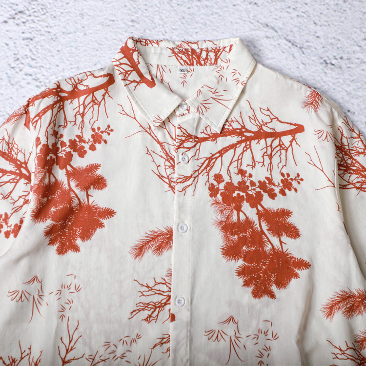 This short sleeve button-up woven shirt features an all-over tree and foliage artwork in warm rust tones. The smooth lightweight fabric drapes cleanly for a polished look, while the full coverage print delivers the impact of custom all over print t shirts. A classic collar, front button placket and curved hem keep the style versatile for both resort and citywear collections.