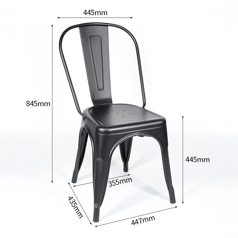 This iconic industrial metal chair is engineered for high-traffic commercial environments like restaurants, cafes, bars, and event venues. Crafted from heavy-duty steel with a smooth matte black finish, it echoes the classic Tolix design with a curved backrest, embossed vertical panel, and vented seat—blending timeless industrial style with practical durability.